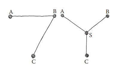 This diagram shows the Steiner tree puzzle and the answer utilizing a Steiner point.
